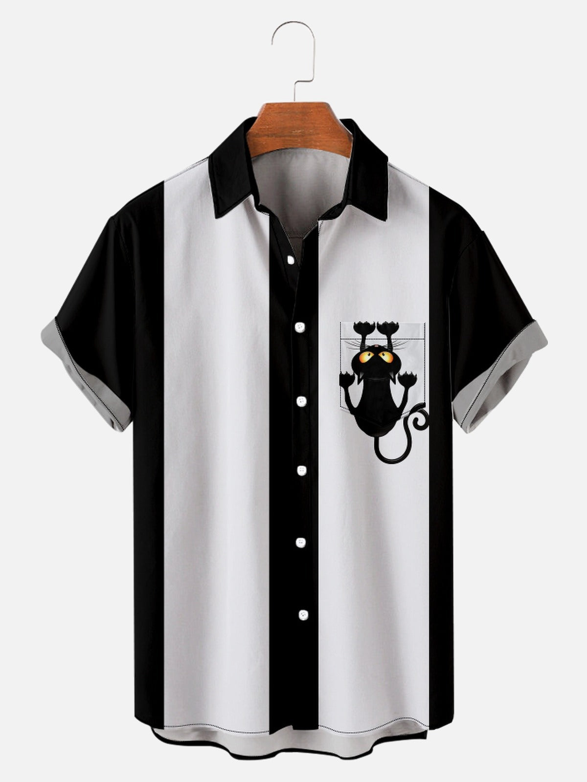 Fun Black Cat Print Pocket Short Sleeve Shirt