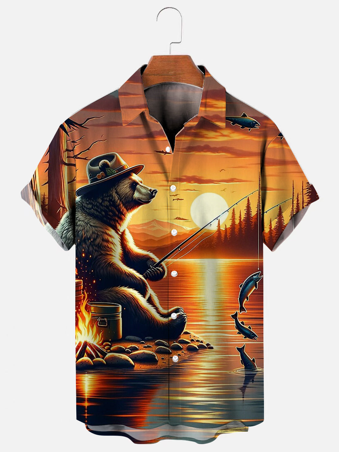 Men's Camping Bear Fishing Print Hawaiian Short Sleeve Shirt