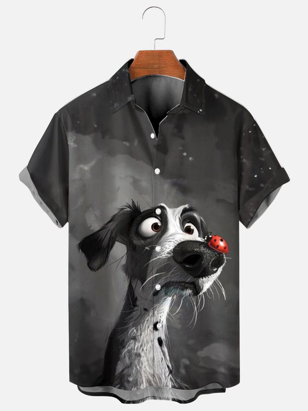 Men's Cartoon Dog Ladybug Fun Print Hawaiian Short Sleeve Shirt