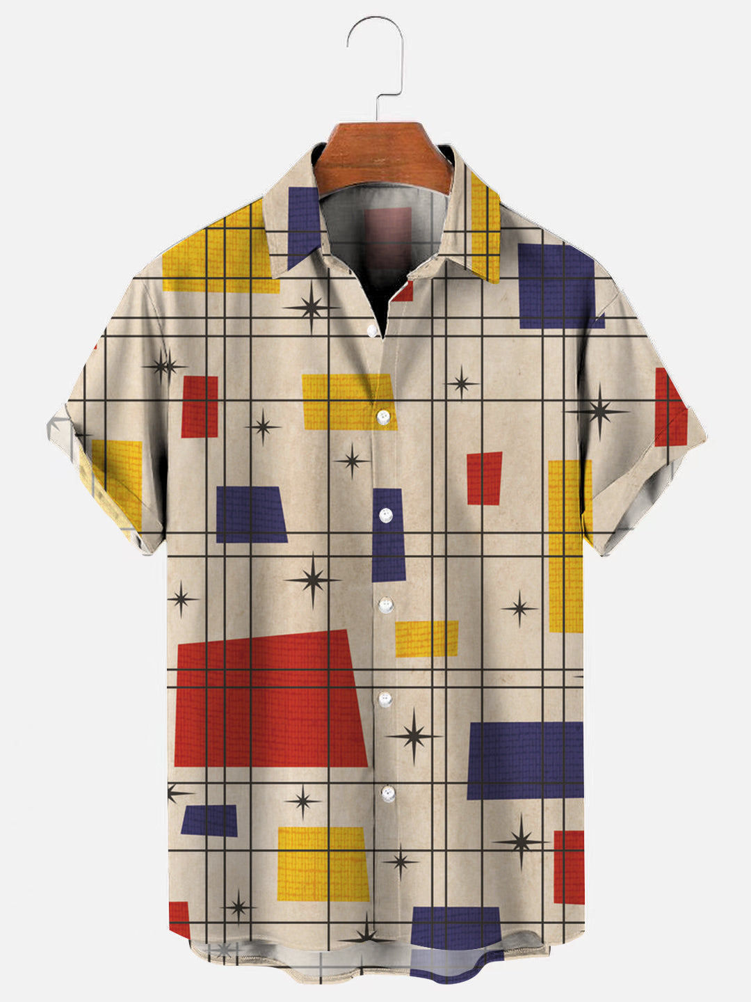 Men's Retro Mid-Century Modern Mondrian Style Art Print Hawaiian Short Sleeve Shirt