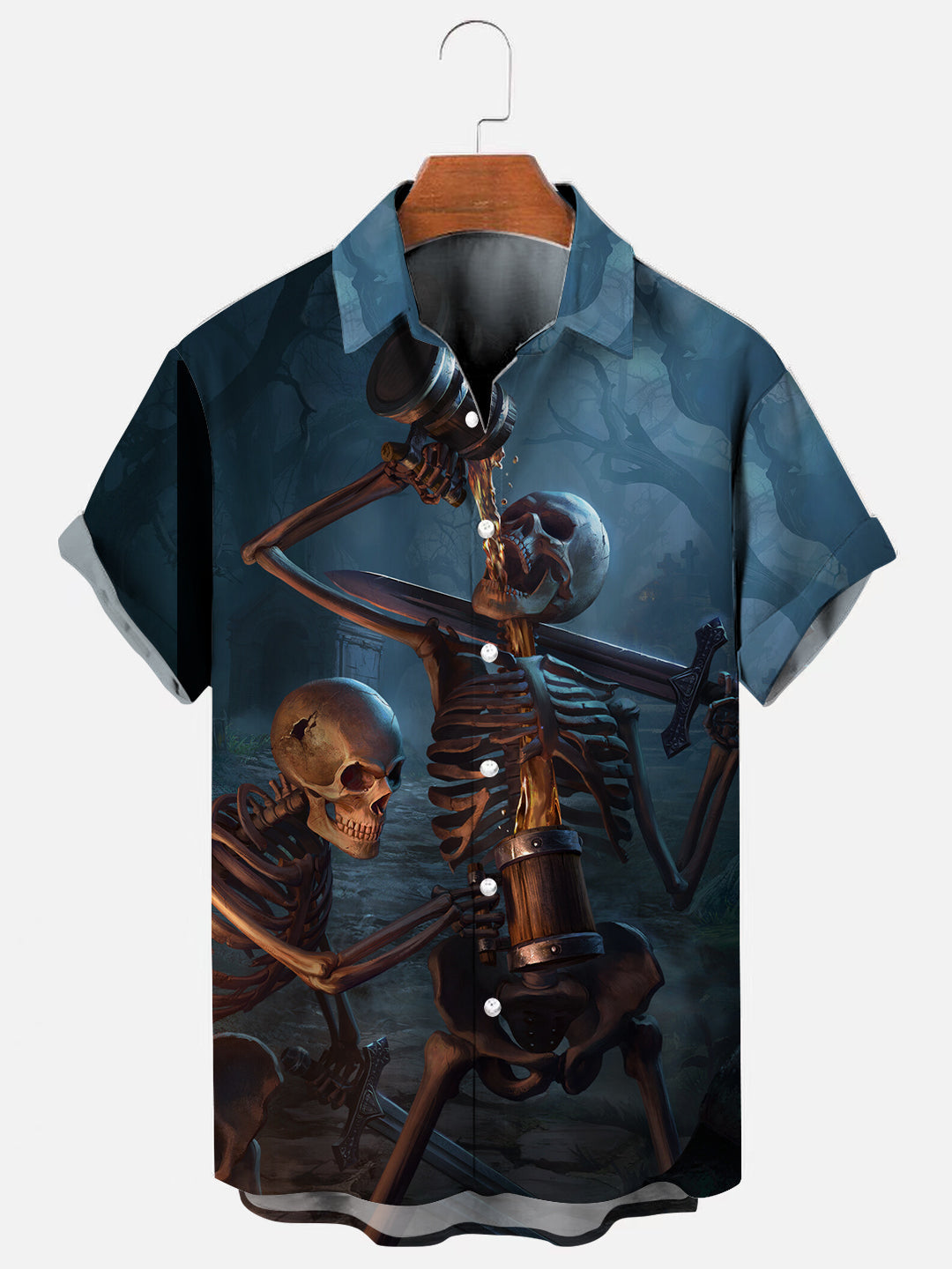 Men's Skull Drinking Beer Pattern Print Hawaiian Short Sleeve Shirt