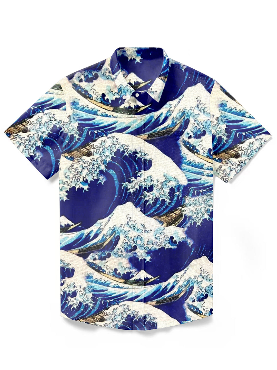 This Hawaiian shirt is a wearable masterpiece! Inspired by Hokusai's legendary woodblock print, it depicts the awe-inspiring "Great Wave" and will make you feel ready to conquer anything.